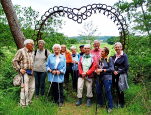 Da der eigentlichen Weg durch langanhaltenden Regen und Reitspuren unpassierbar war, bog die Gruppe auf einem Weg ab, der sie durch das Ehemalige Bergwerksgelände „Langenbroicher Heide“ führte. Hier entdecke sie, ein aus alten Hufeisen geformtes Herz, welche zu einem Foto anregte. Vorbei am „Blauen See“ und passieren der Landstraße führte der Weg zurück zum Schützenplatz. Wenige Minuten vor Erreichen des Ziels, setzte noch leichter Regen. Schließlich erreichte die Gruppe nach zwei Stunden ihr Ziel.
