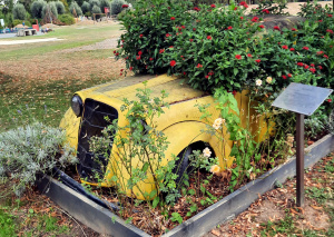 „Kunstobjekte“ wie verschiedene Skulpturen aber auch mit Pflanzen verzierte Oldtimer. Nach einer kurzen Stärkung wurde der weitläufige Park weiter durchschritten und am Ender der Tour wurde die Heimfahrt wieder angetreten.