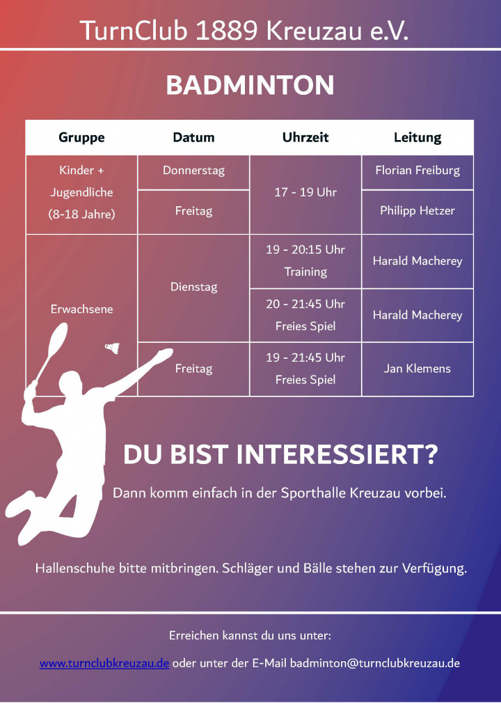 Erstes Badmintonturnier des TurnClubs 1889 Kreuzau für Erwachsene Zum ersten Mal hat die Badmintonabteilung die „Kreuzau Open“ ausgerichtet und dazu zahlreiche Meldungen aus dem Umland erhalten. Aus Aachen, Krefeld oder Koblenz, aber auch aus...