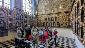 Nach mehreren Erklärungen über die Entstehung der Kirchen führte uns Uli über den Altarraum, wo auf großen Gemälden die Geschichte der hl. Ursula dargestellt wurde. Z.Zt. der Erstehung der Bilder konnten nur wenige Menschen Lesen und Schreiben, so entstanden wohl lt. Uli, die ersten „Comics“.