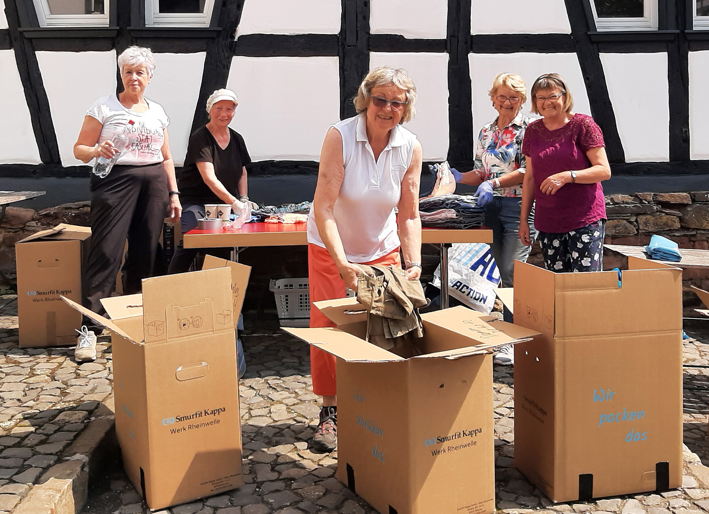 Die Freitags-Gymnastikgruppe des Turnclubs Kreuzau hilft beim Sortieren und Packen von Sachspenden für die Flutopfer, Foto: TCK