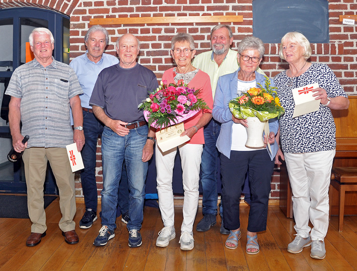 Jubilare des Turnclubs Kreuzau geehrt: (v.l.) Klaus Aub, Albert Bach, Geschäftsführer Matthias Voßen, Ursula Flick, Vorsitzender Edwin Suermondt, Aloisia Fleck und Renate Schall, Foto: Bernd Klass